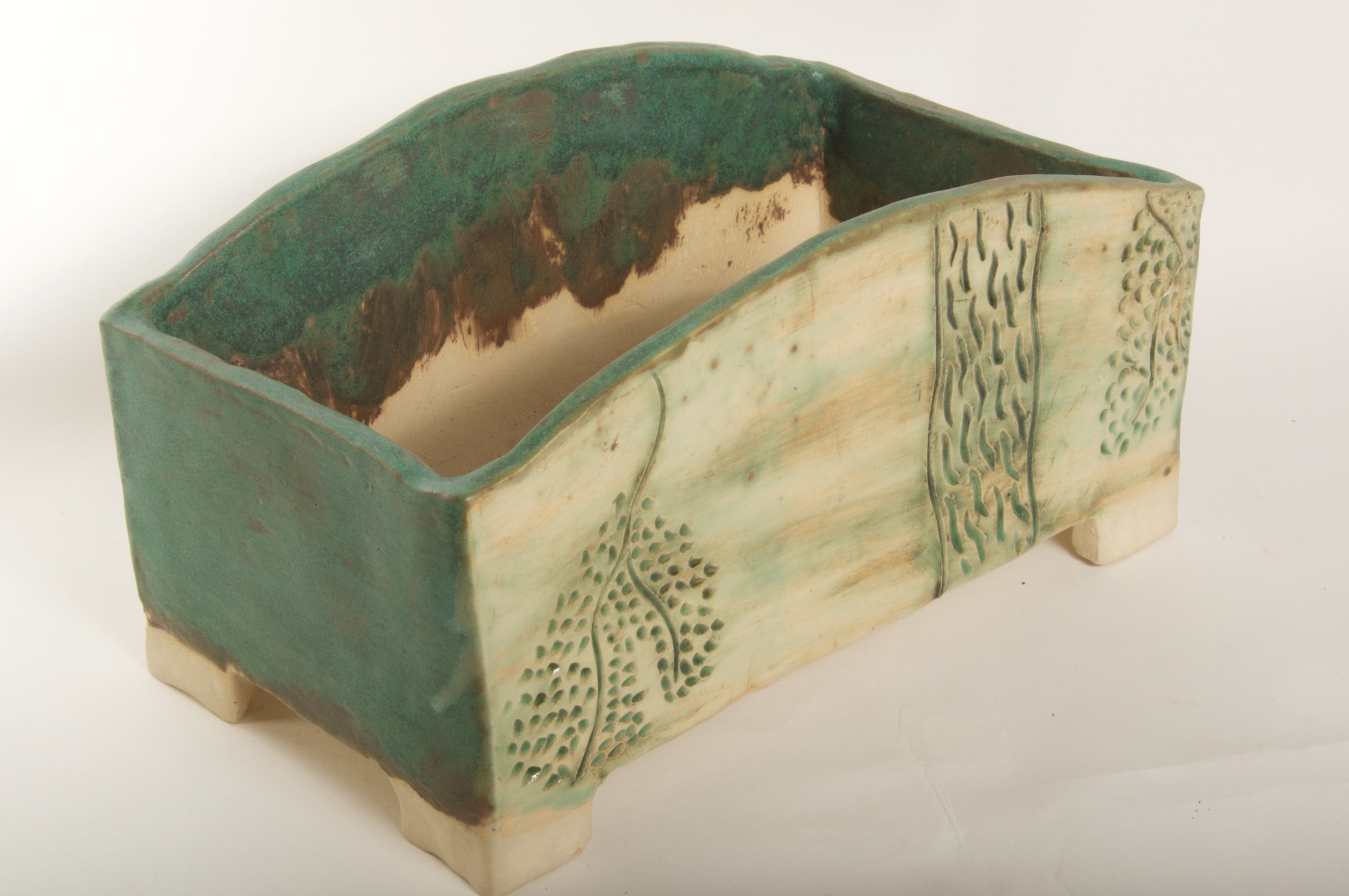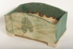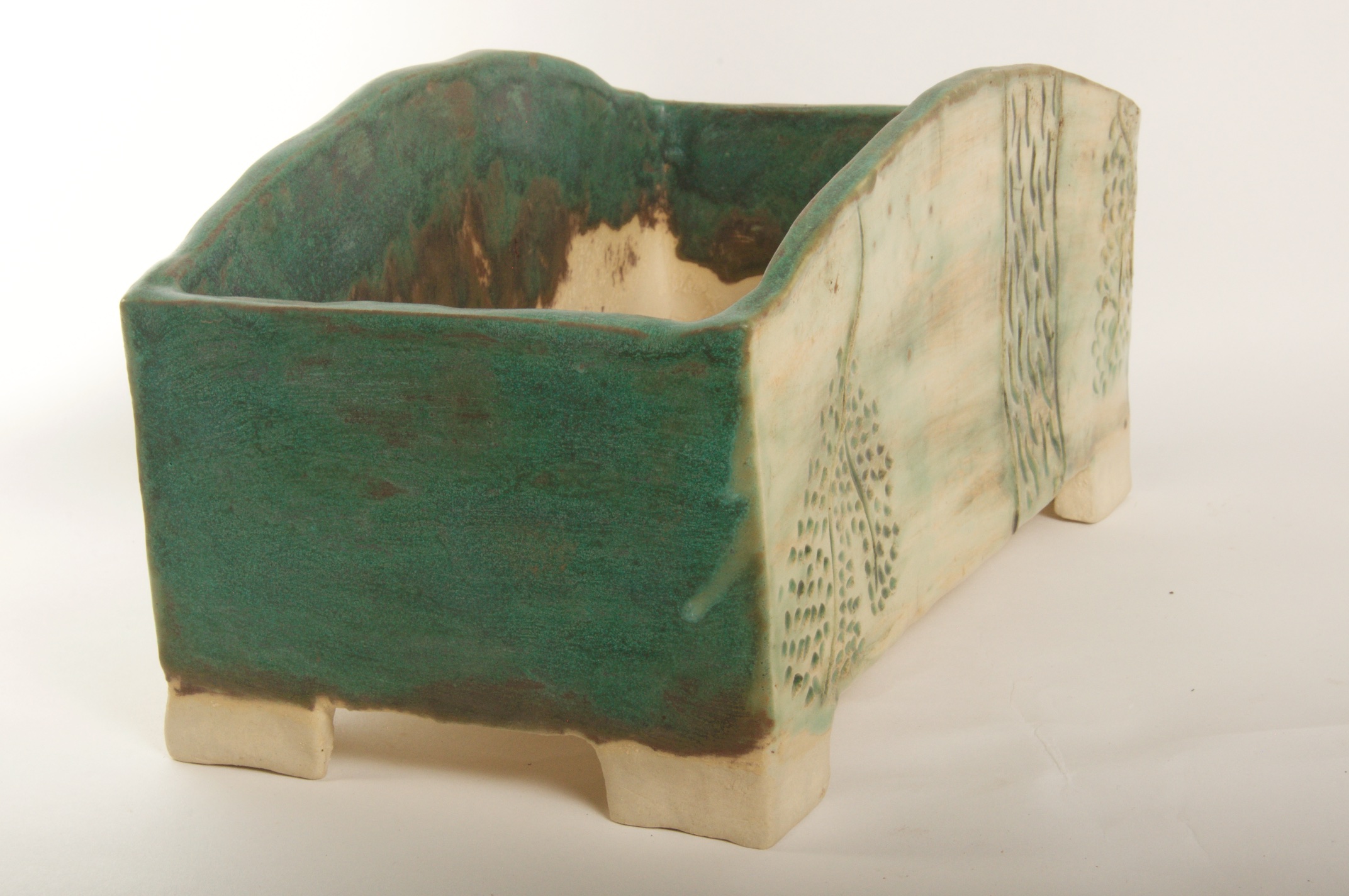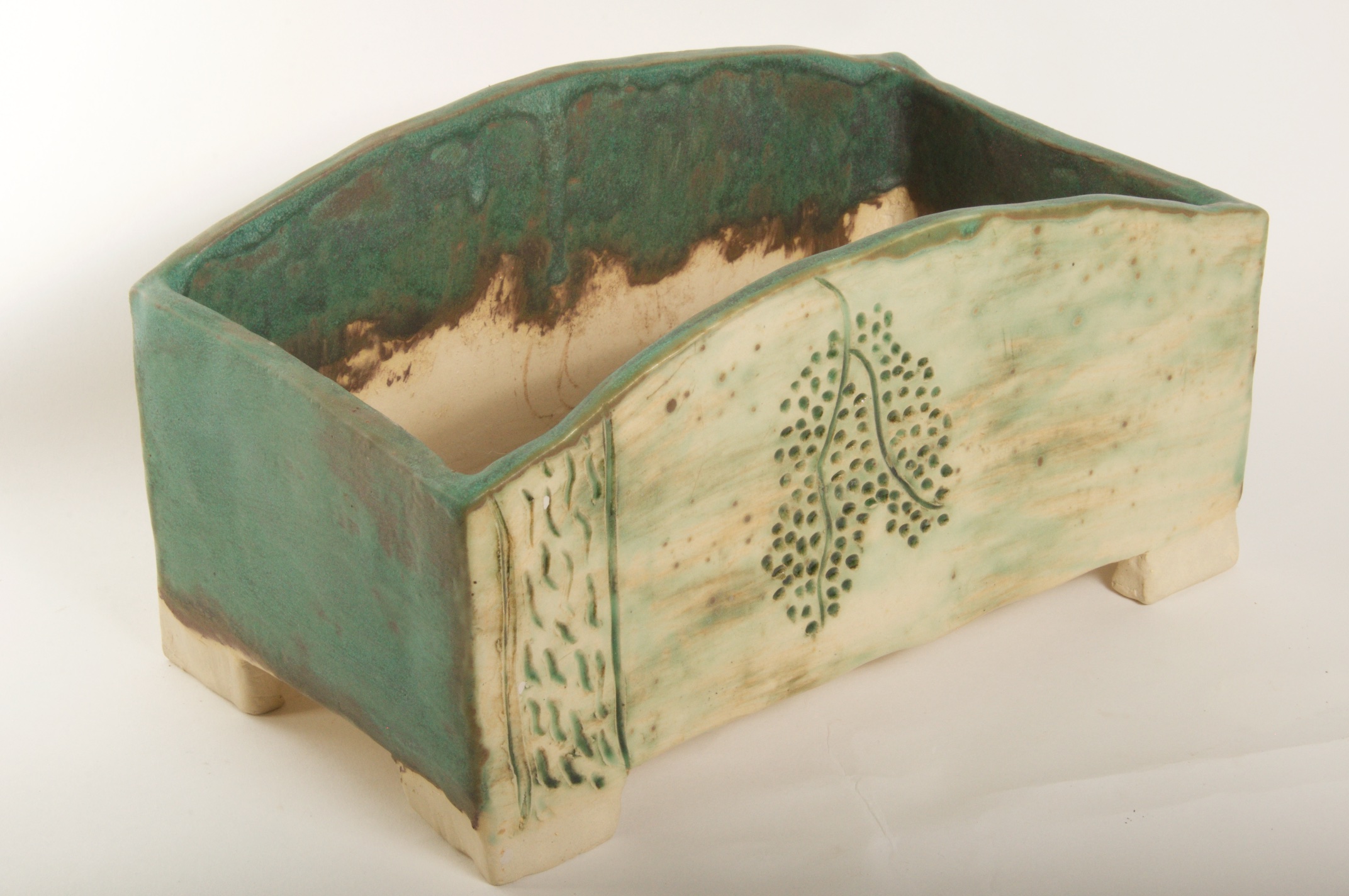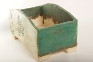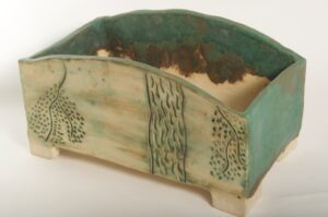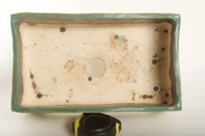 Rectangular Green Glazed Bonsai Pot w/ Sgraffito Tree/Leaf Design – Available Immediately