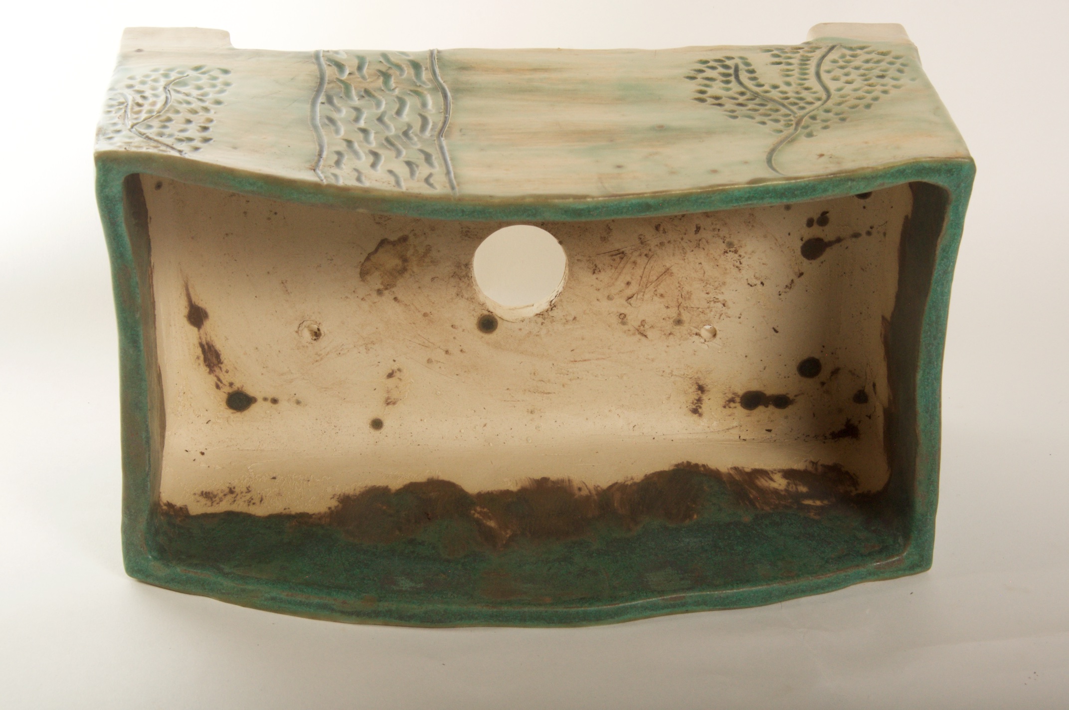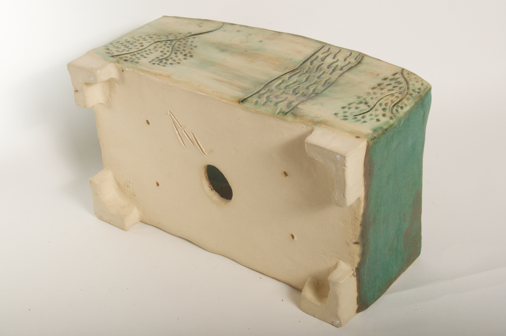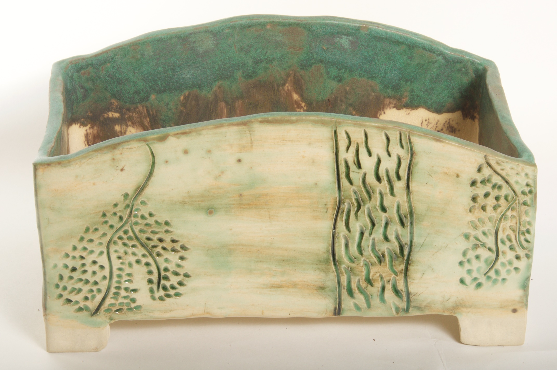 Rectangular Green Glazed Bonsai Pot w/ Sgraffito Tree/Leaf Design – Available Immediately