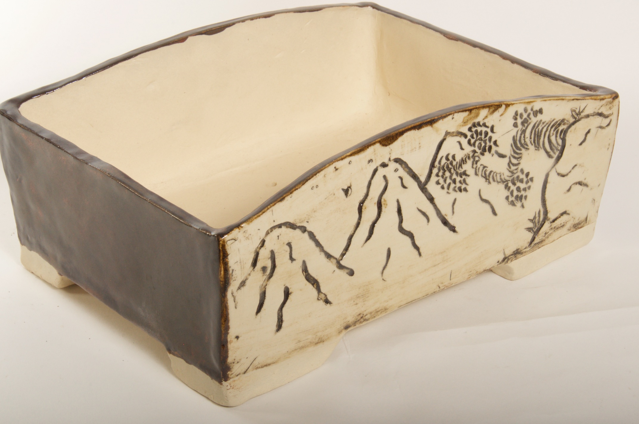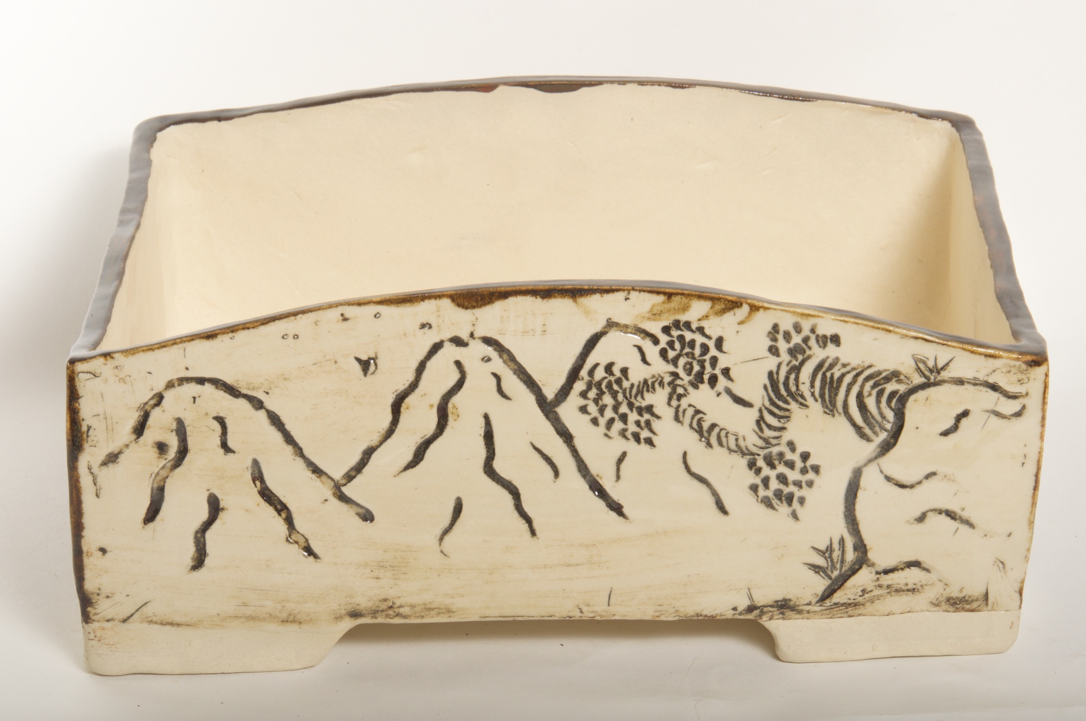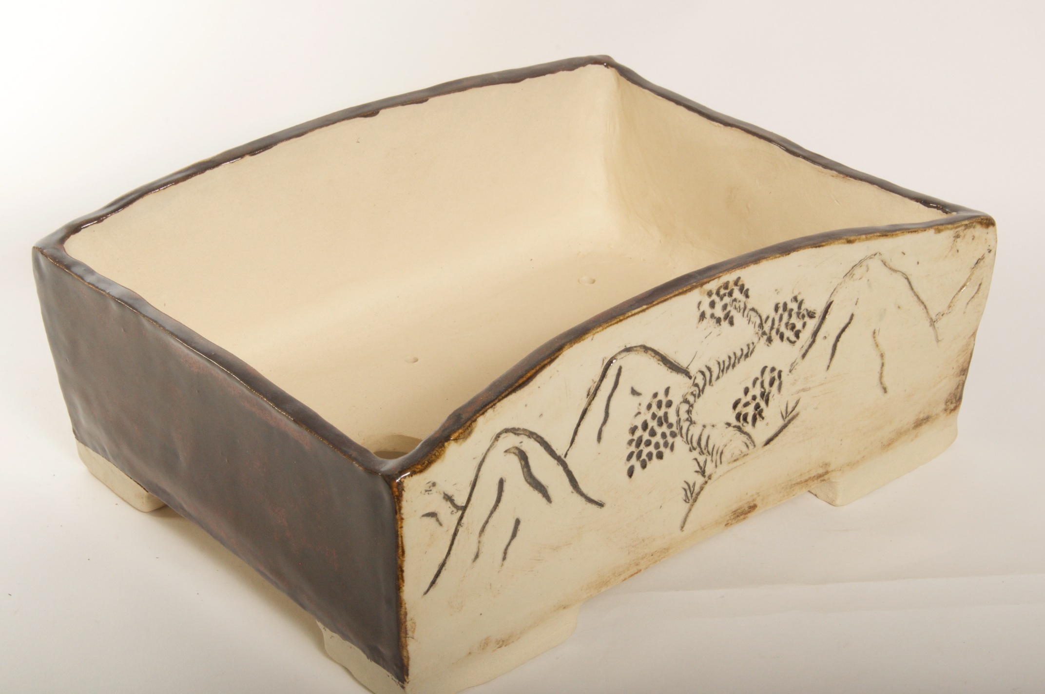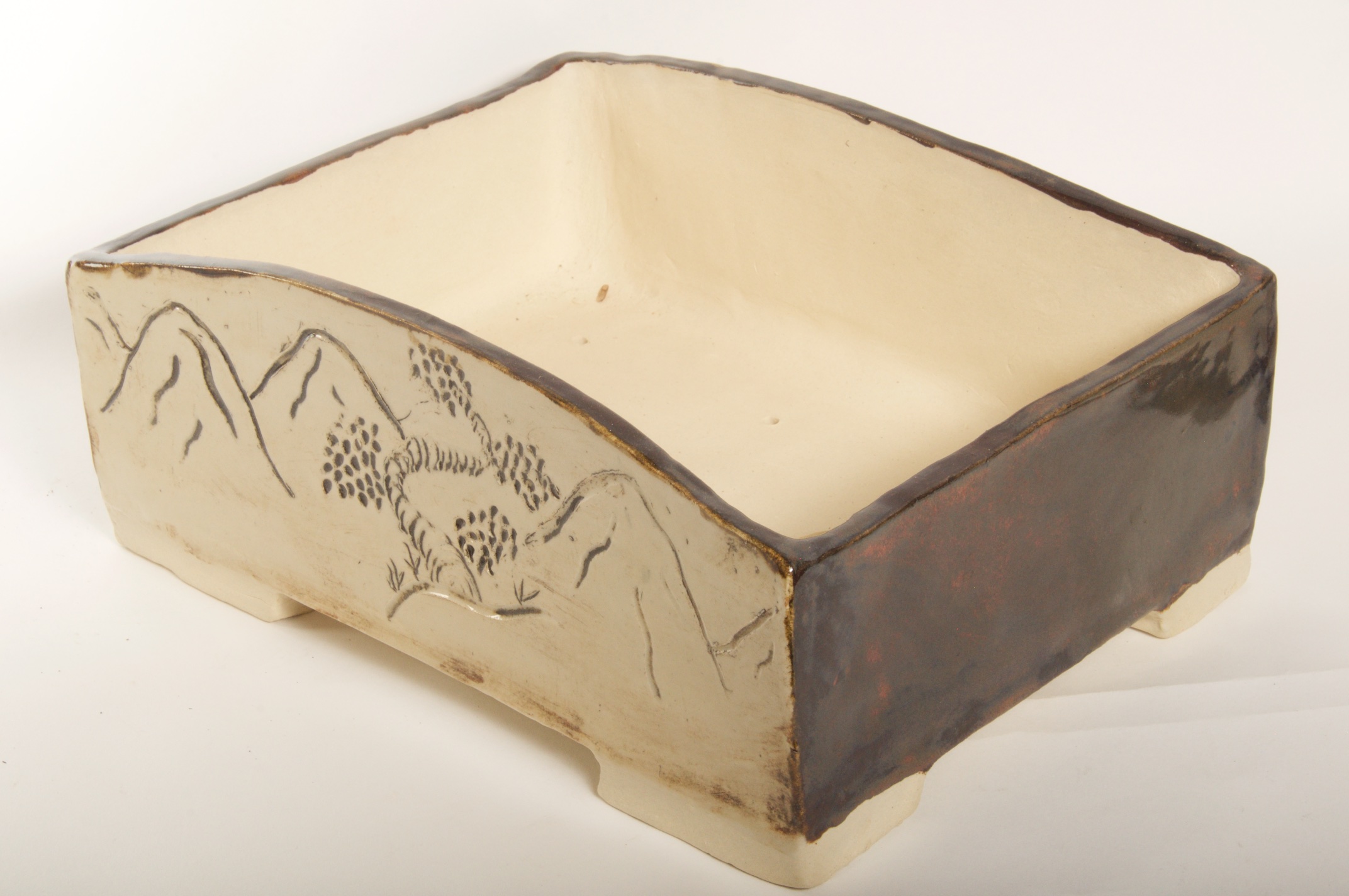 Rectangle Glazed Burned Red/White Bonsai Pot w/ Sgraffito Mountain/Tree Scenes – Available Immediately
