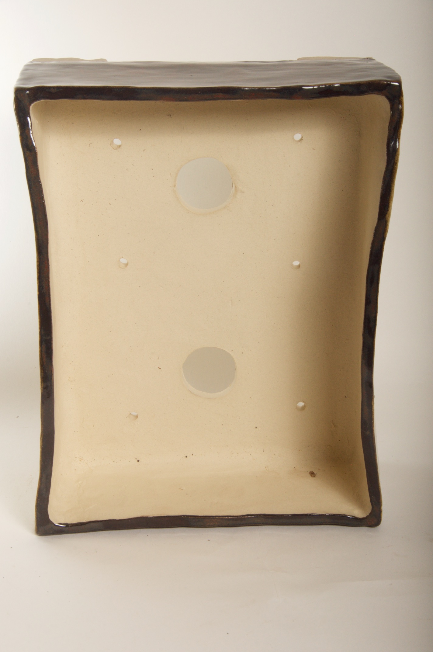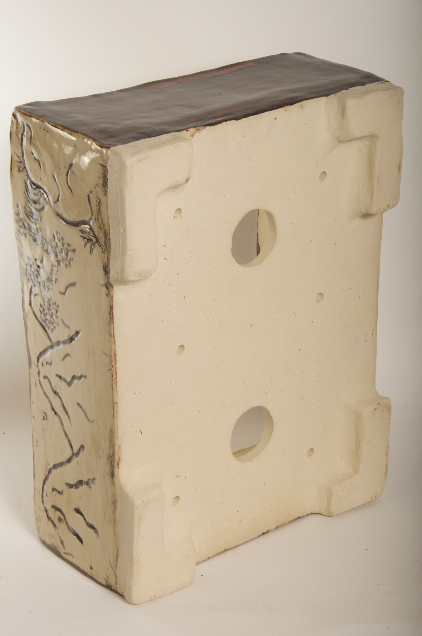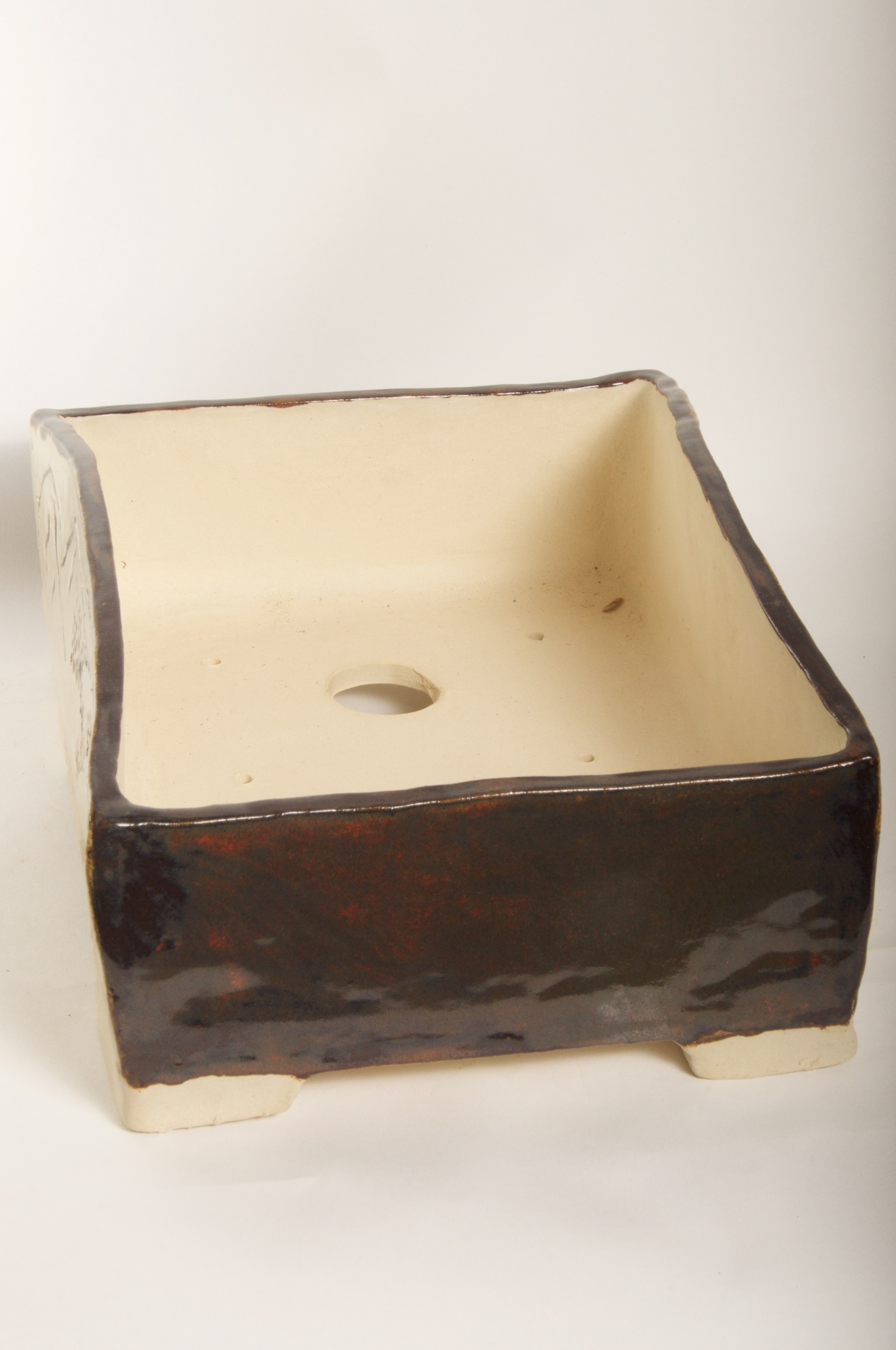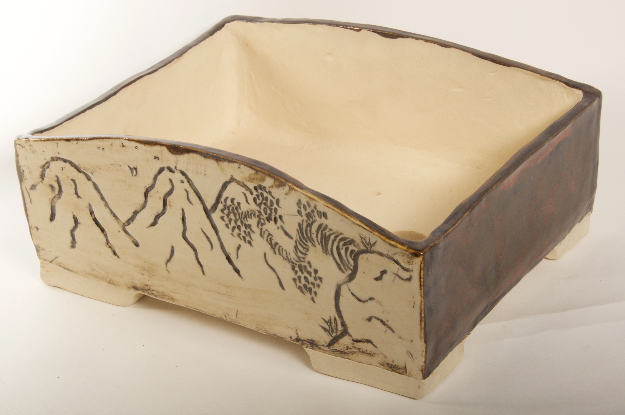Rectangle Glazed Burned Red/White Bonsai Pot w/ Sgraffito Mountain/Tree Scenes – Available Immediately