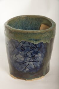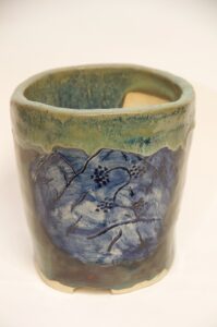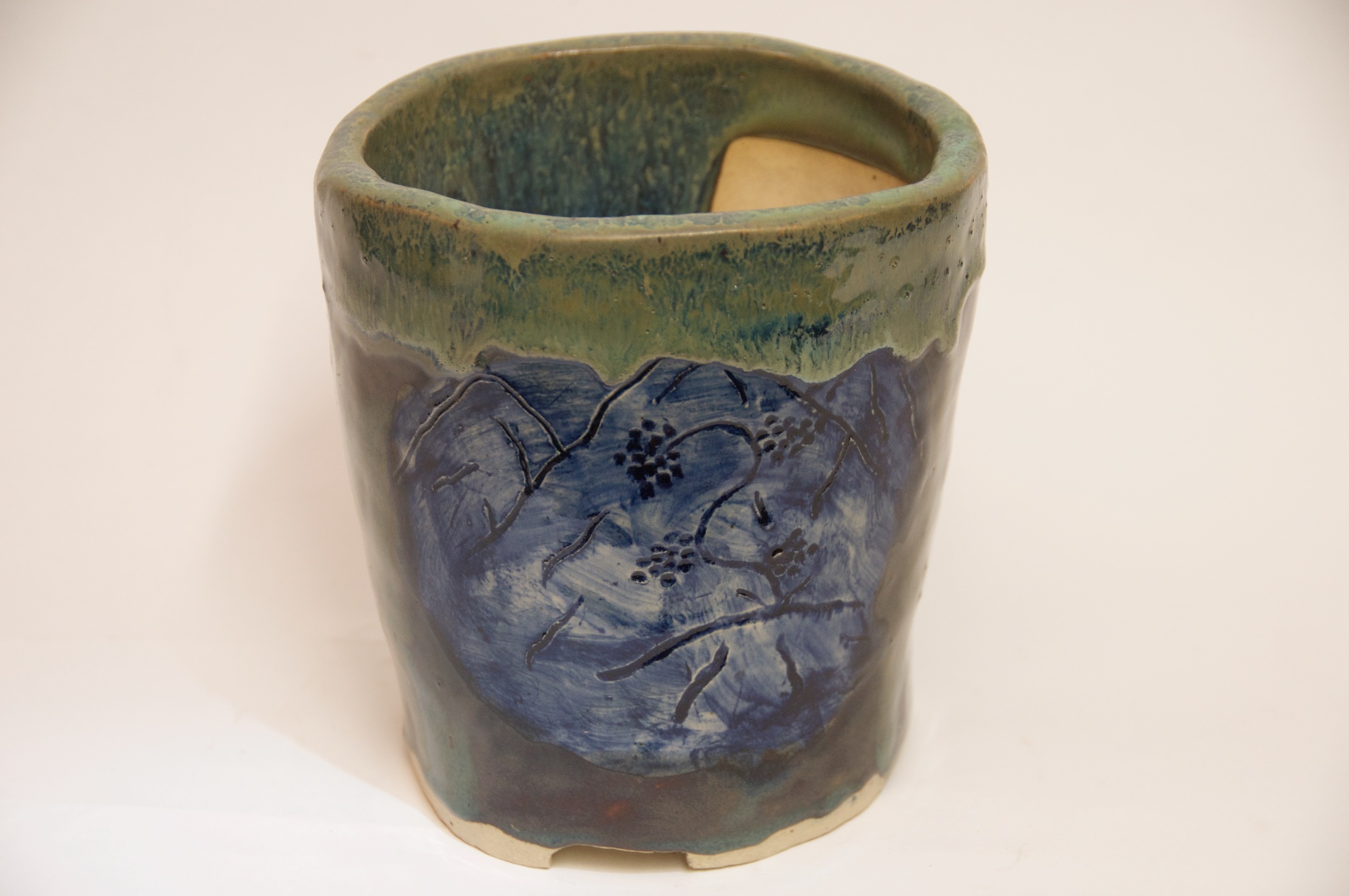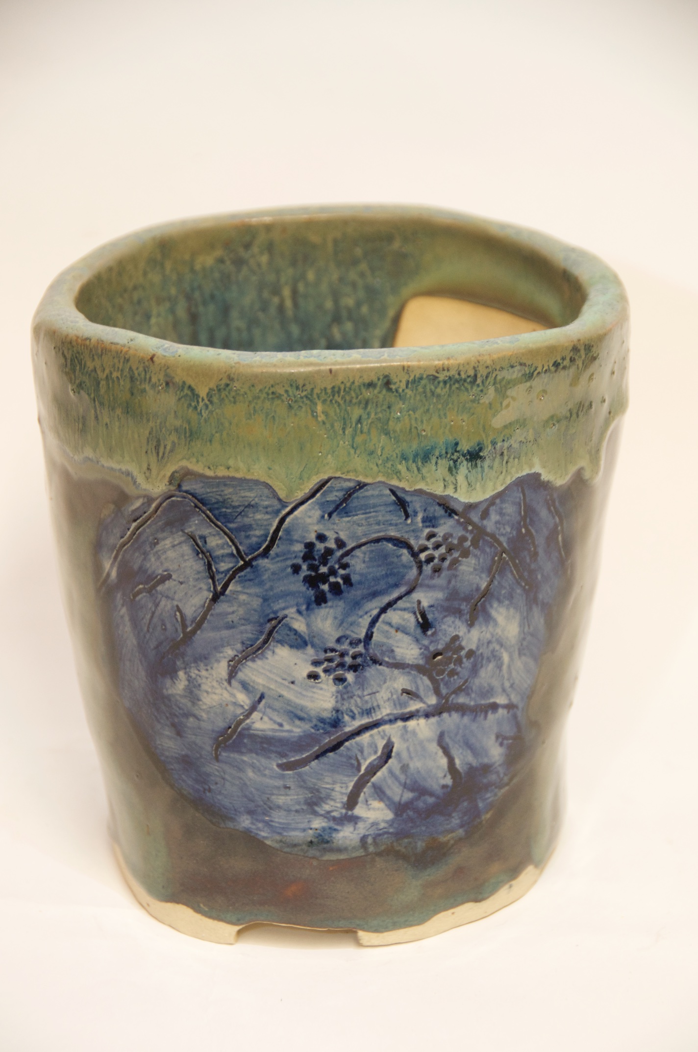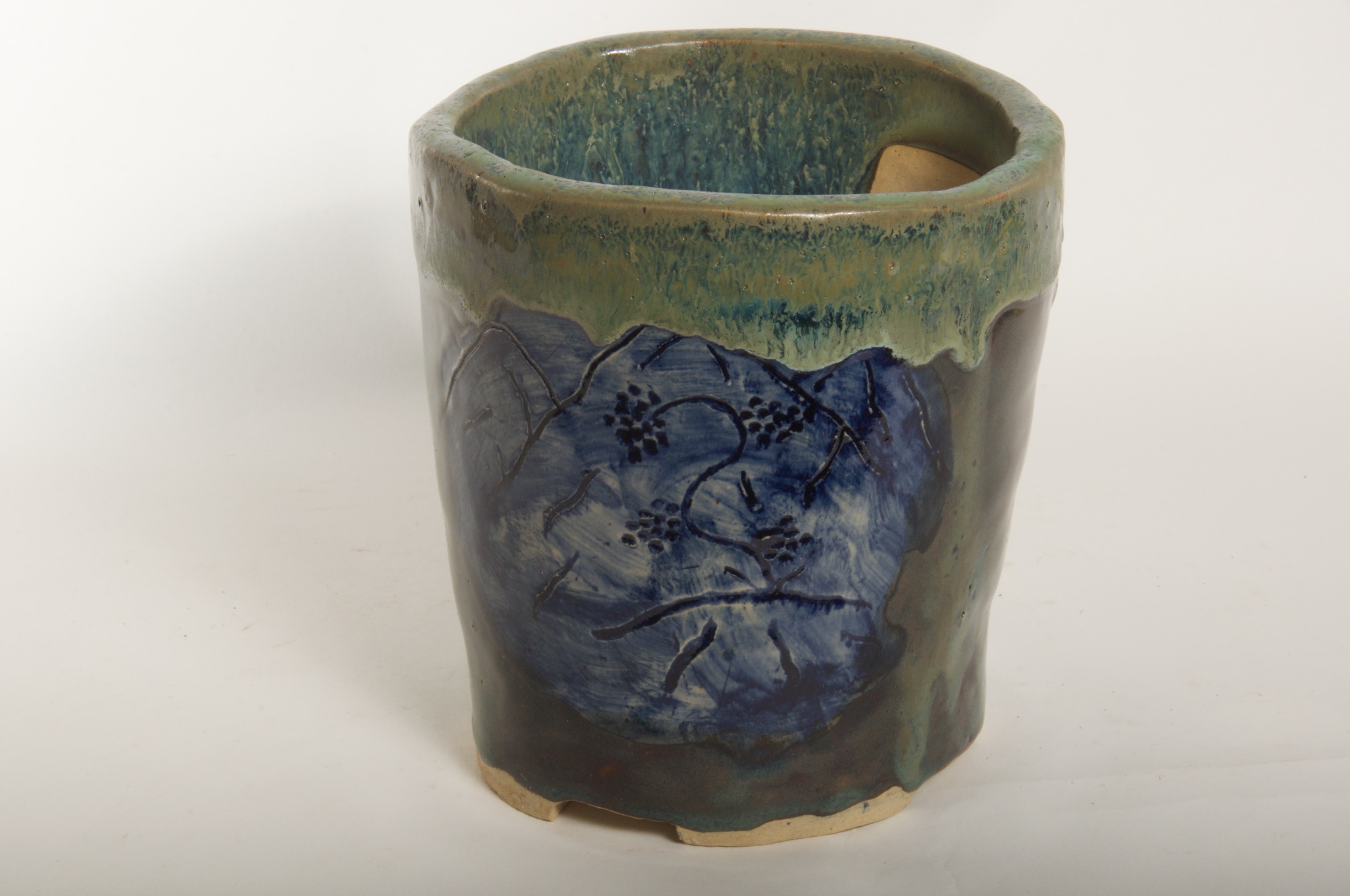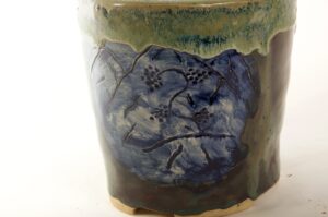 Round Glazed Cascade Bonsai Pot w/ sgraffito mountain/tree scene – Available Immediately