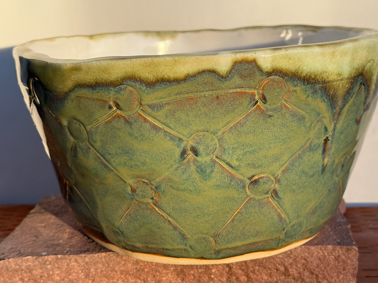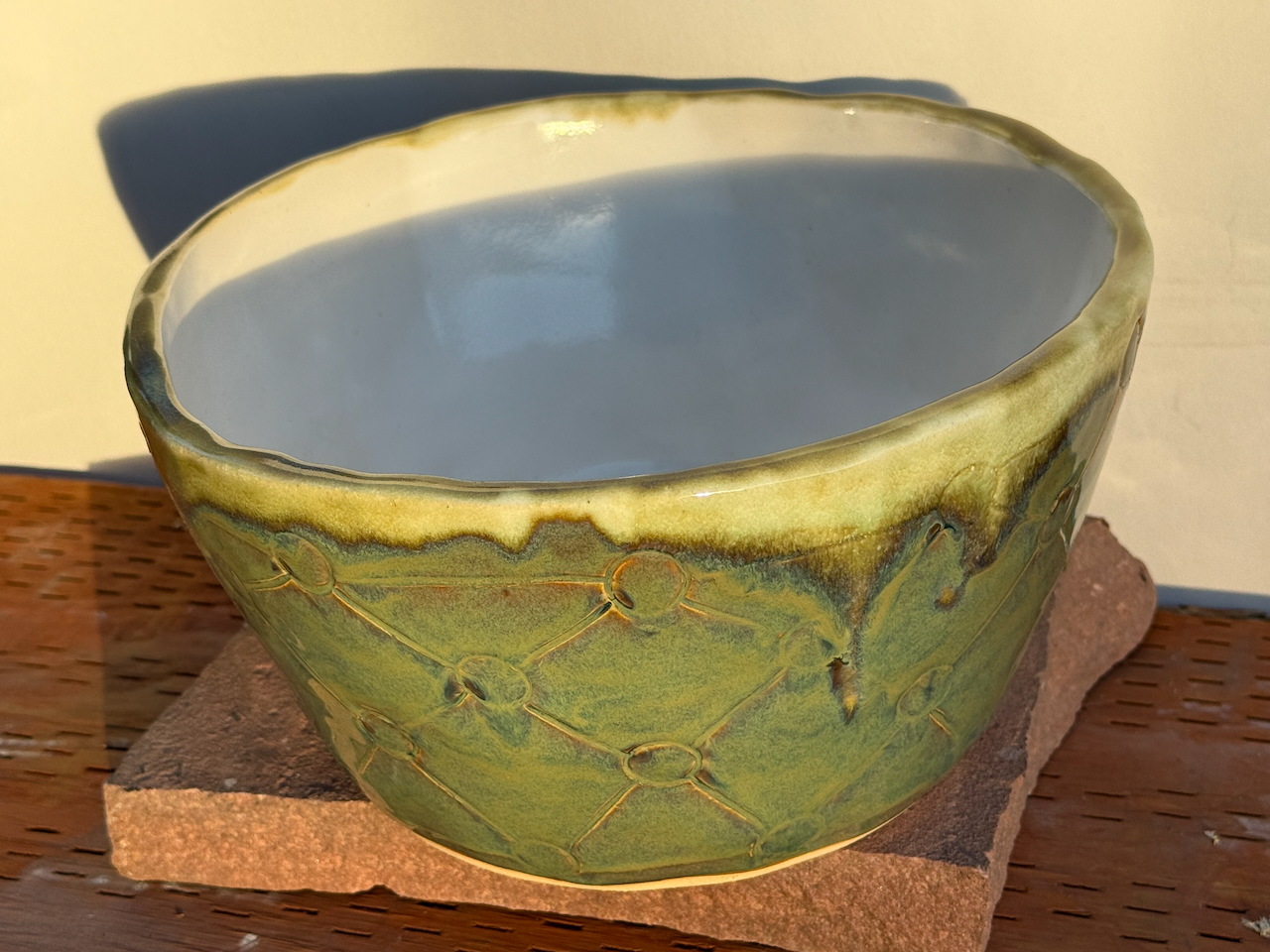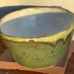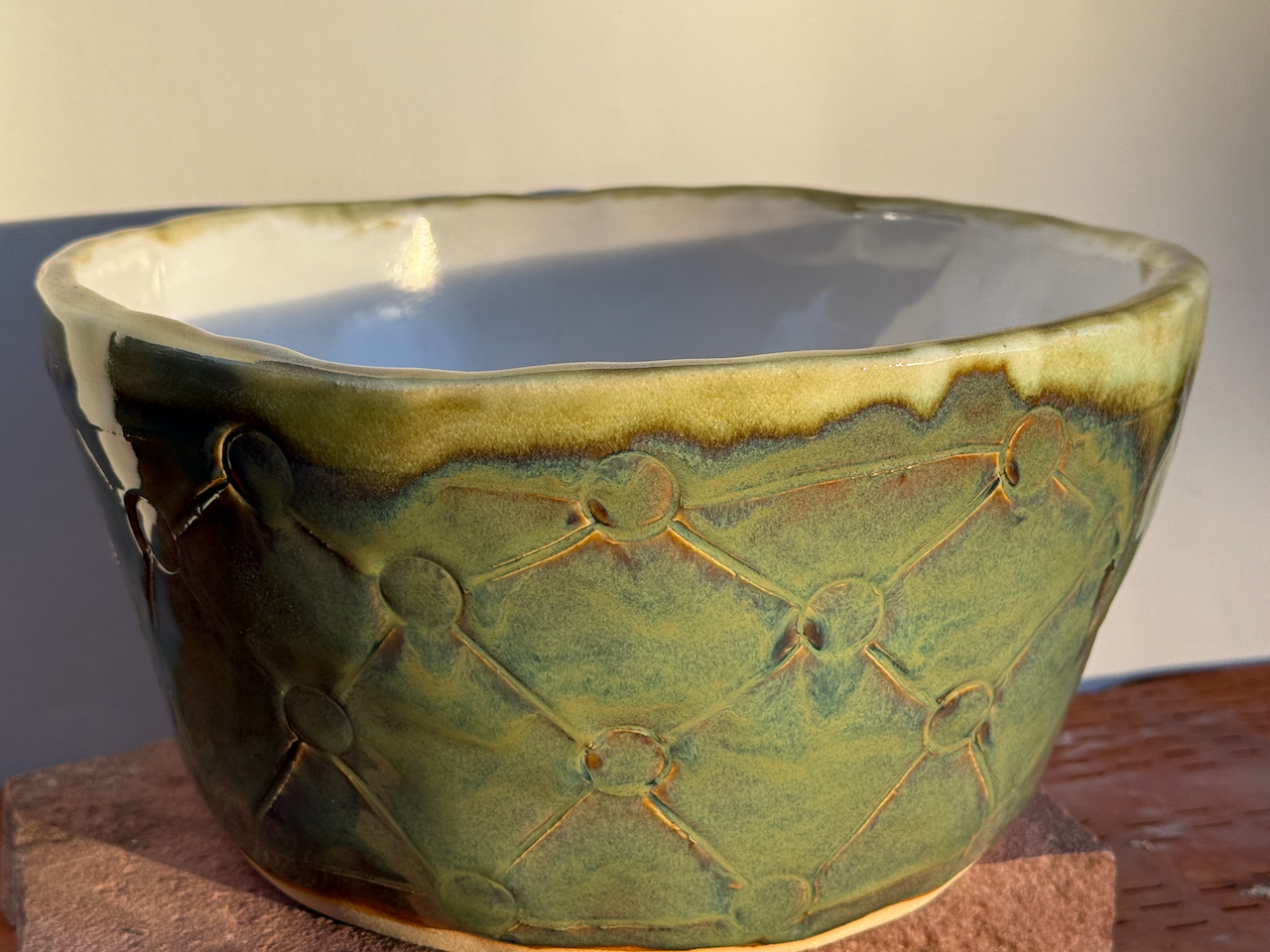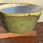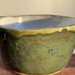 Looking for a perfect gift for family or friends? Or looking for a beautiful ceramic piece to not only admire but to use? This is a large hand-built ceramic bowl from WorldTraveler Creative Designs, by Aaron Loukonen. This fully functional, food safe bowl features a patterned surface, hand carved with a unique design. The glaze is a vibrant bluish-green with hints of brown. The interior, creamy white, is fully glazed. Fully vitrified and cold/moisture hardy. Each piece is unique and one-of-a-kind.