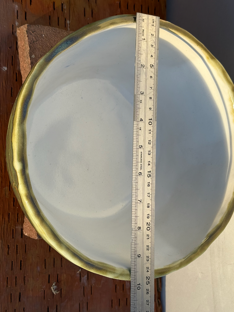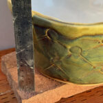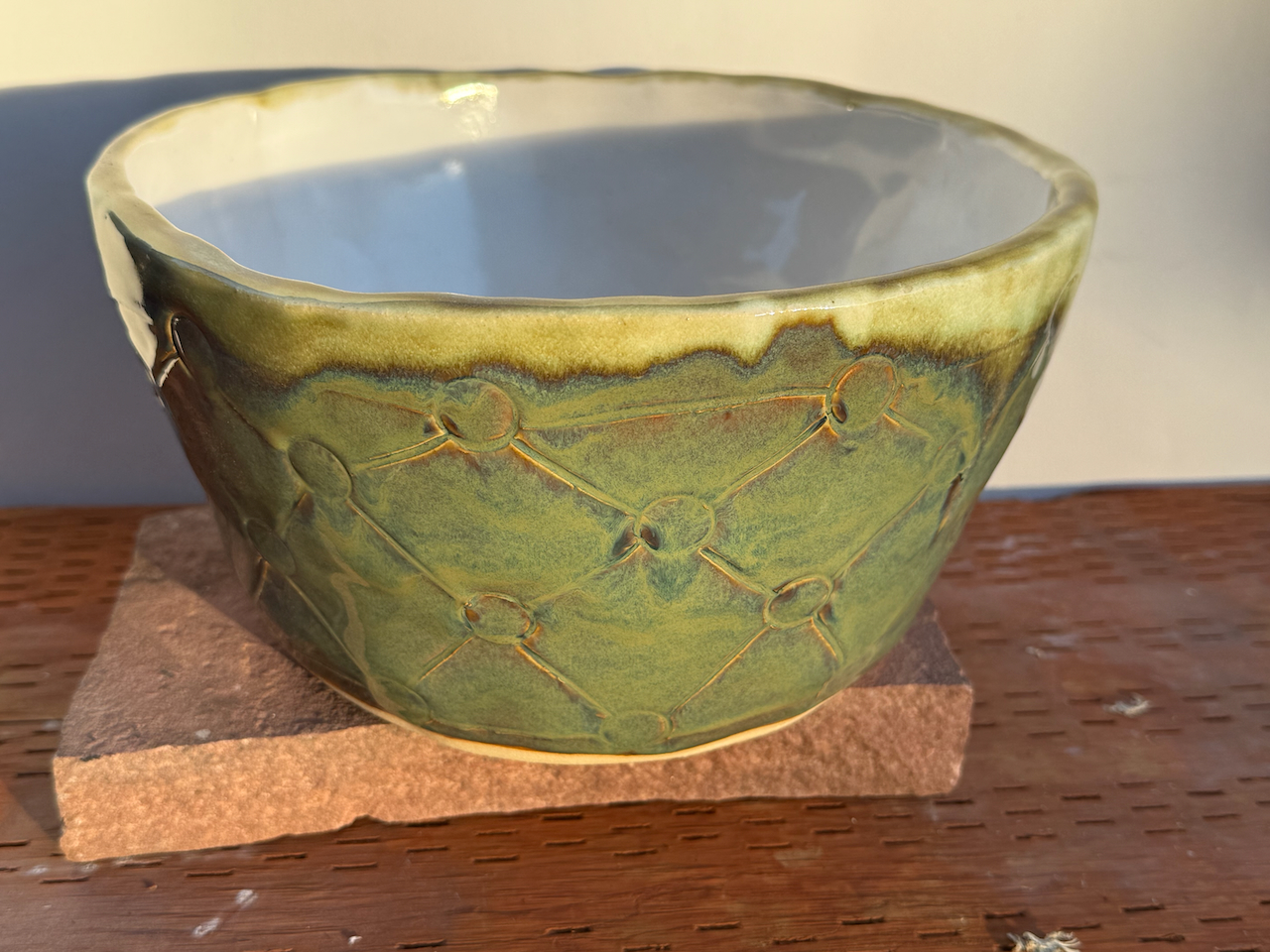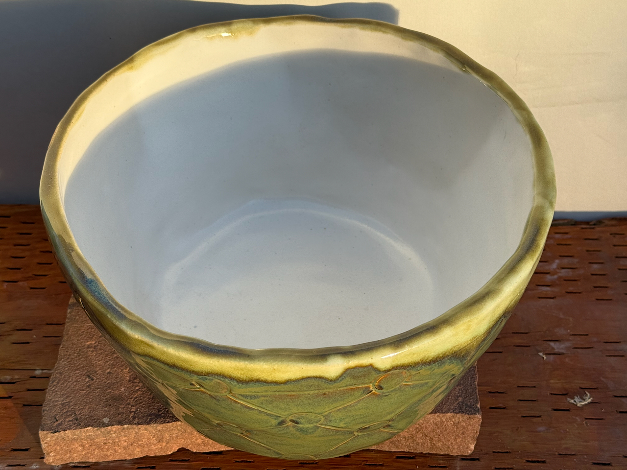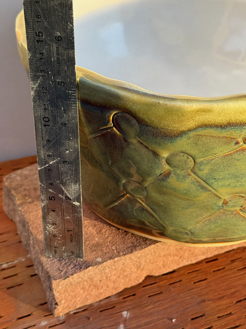 Looking for a perfect gift for family or friends? Or looking for a beautiful ceramic piece to not only admire but to use? This is a large hand-built ceramic bowl from WorldTraveler Creative Designs, by Aaron Loukonen. This fully functional, food safe bowl features a patterned surface, hand carved with a unique design. The glaze is a vibrant bluish-green with hints of brown. The interior, creamy white, is fully glazed. Fully vitrified and cold/moisture hardy. Each piece is unique and one-of-a-kind.
